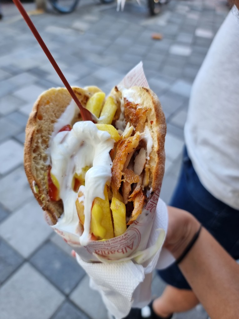 Une fois installés, nous sommes partis quasiment de suite, car il était déjà 13h et le free tour démarrait à 14h00. Malgré notre grignotage au marché un peu plus tôt, nous avions toujours faim. Nous avons donc décidé de trouver un snack pas loin du point de rendez-vous du free tour. Nous sommes donc allés chez Fast Food Albania et avons pris un sort de kebab qui nous a couté moins de 3€ chacun. Et il était vraiment bon!