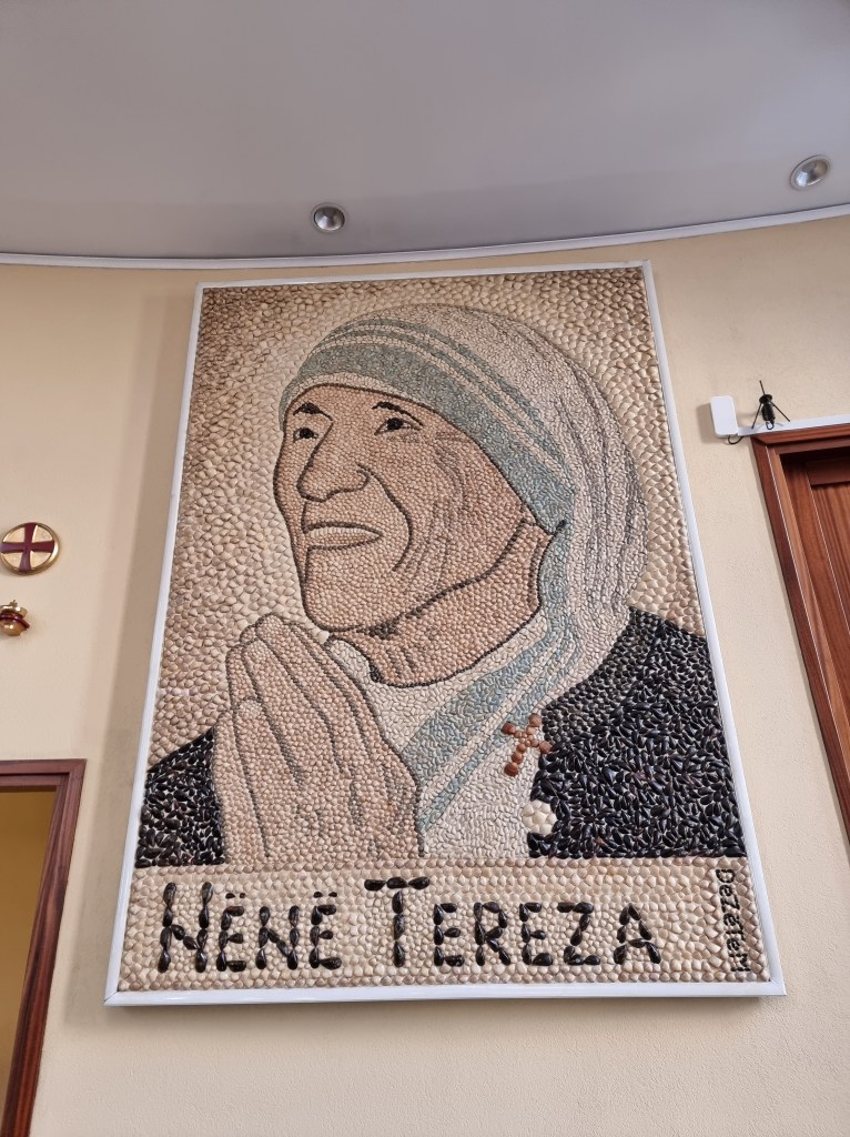 Un de mes stops préférés de ce free tour était l’église dédiée à Mère Teresa, spécialement un portrait à son effigie fait entièrement de coquillages. Malgré le fait qu’elle soit née ou actuellement se trouve la capitale de la Macédoine du Nord, Mère Teresa était d’ethnie albanaise.