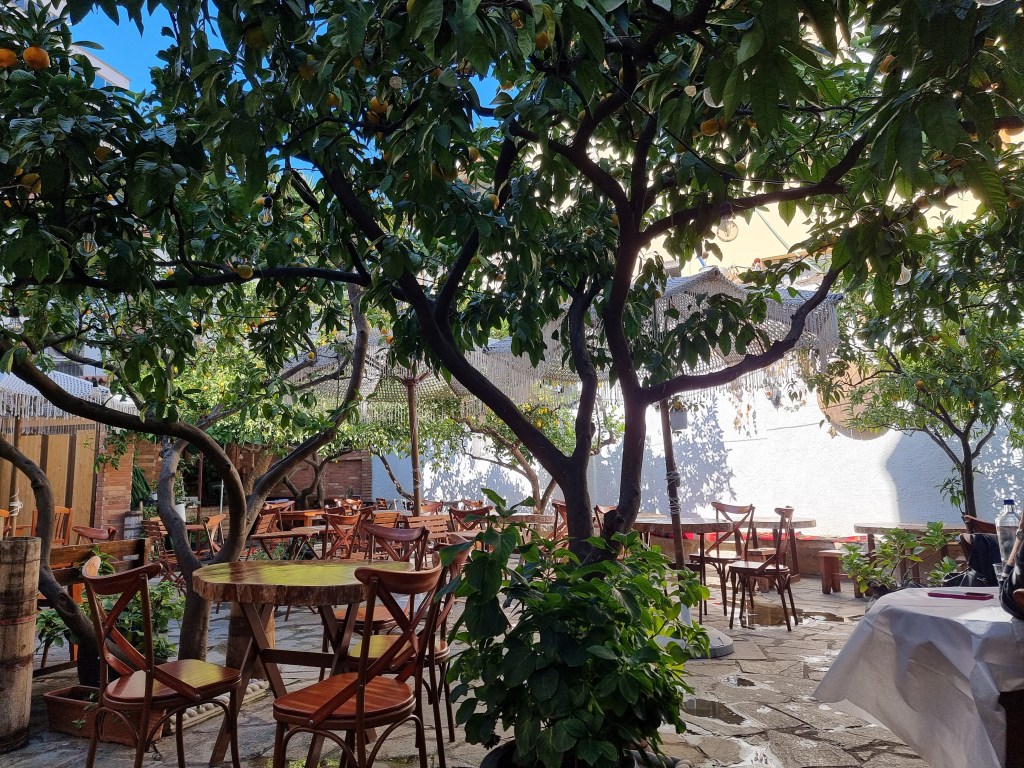 Il était presque midi, donc nous sommes partis vers le restaurant Oda. Il était très bien évalué et il y avait une terrasse vraiment sympathique. Le menu était petit et avec des plats albanais traditionnels.