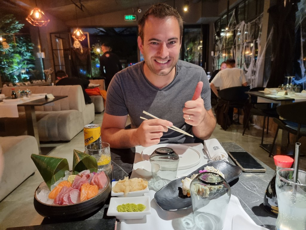 Notre petite promenade a duré environ 1h30. Une fois le tour du lac fini, nous sommes partis en direction d’un restaurant de sushi à volonté que nous avions repéré la veille. Bon, d’habitude je préfère manger local lors de mes voyages, mais comme j’adore les sushis et il est assez difficile de trouver des restaurants de sushi à volonté de qualité ou j’habite, nous avons décidé de tester ce restaurant. Il s’appelle Amo Sushi et je le recommande vivement! La formule à volonté coûte la modique somme de 2990 ALL (environ 26€) le soir et inclus une énorme quantité de sushis différents. Les sushis étaient délicieux et nous nous sommes vraiment régalés! Si vous venez manger ici à midi, la formule coûte seulement 2200 ALL (environ 19€).