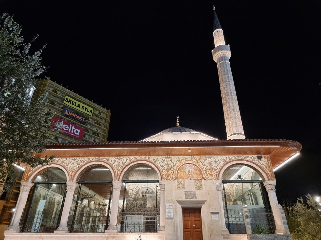 Suite à ce moment assez unique, nous avons continué notre tour nocturne. Nous sommes tombés face à face avec la mosquée Et’hem Bej. Apparemment, l’intérieur de cette mosquée est assez intéressant car il y pas mal de fresques sur les murs ainsi que au plafond. Malheureusement nous n’avons pas eu le temps de visiter son intérieur, mais sa partie externe est déjà assez belle.