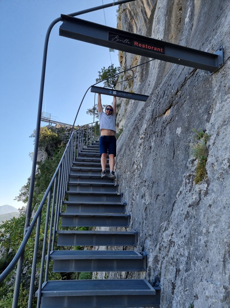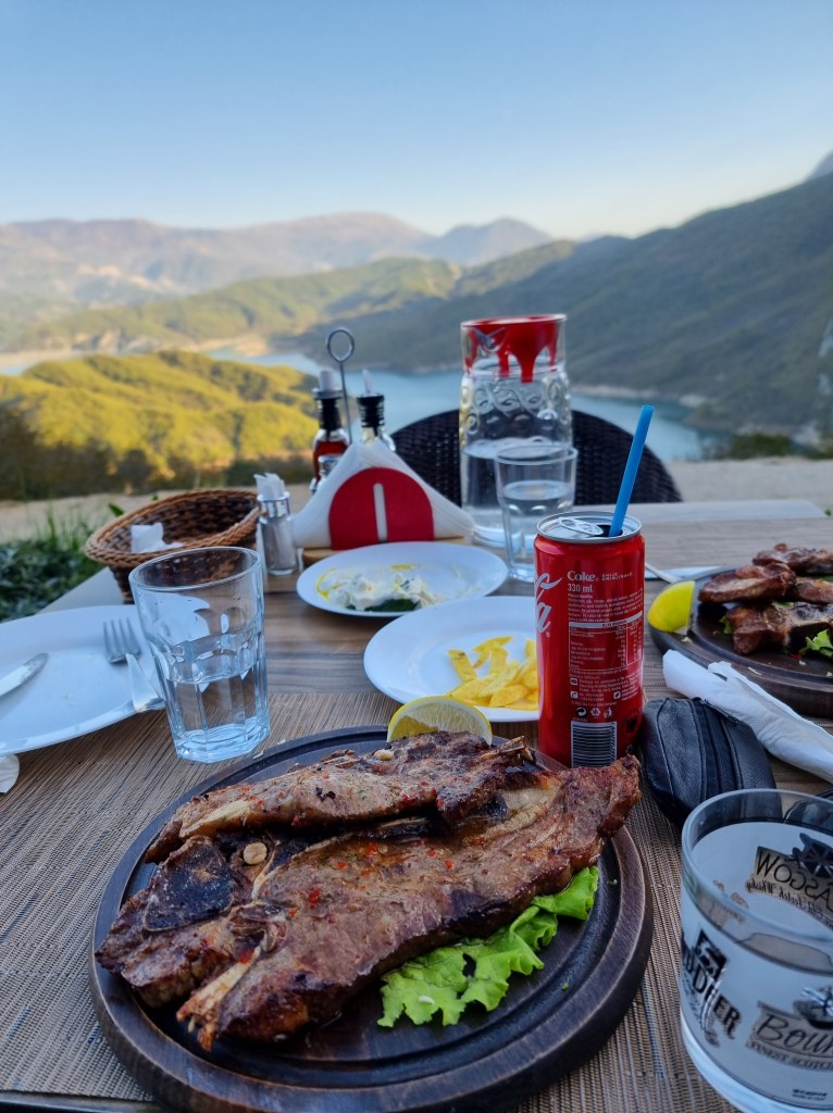 A côté des marches aménagés, il y a un petit restaurant. Vu qu’il était déjà midi passé quand nous sommes descendu du belvédère, nous avons décidé de nous poser au restaurant pour le déjeuner. Le menu est très simple et nous avons choisi de prendre un plateau de fromage, des frites et des grillades. Les grillades ont mis beaucoup de temps à arriver, mais elles étaient bonnes, ainsi que tout le reste. Mais le plus spécial était sûrement la vue sur le lac pendant le repas! Ce repas fût le plus cher du séjour, la note s’élevant à une trentaine d’euros.