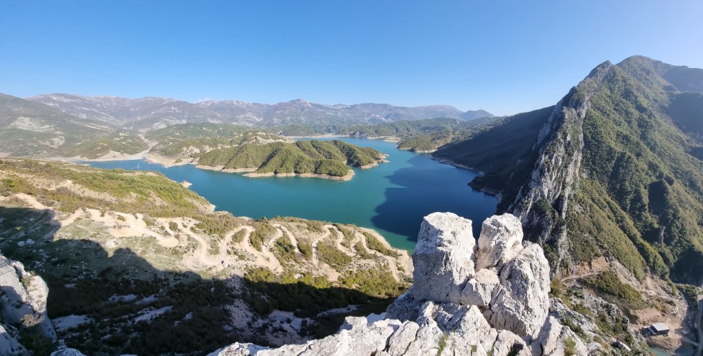Même si la route est vraiment pas terrible, cela vaut vraiment le coup de la franchir. Le lac est tout simplement magnifique, ainsi que le paysage autour qui est rempli de montagnes. Il y a un escalier aménagé sur la roche, ou vous pouvez monter pour avoir une vue panoramique du lac. Pour y accéder, nous avons du payer 100 ALL (environ 0,90€) chacun si je ne me trompe pas. Il y a un petit panneau disant que la montée est payante et en tout cas il y a un gars à côté pour vous demander l’argent.