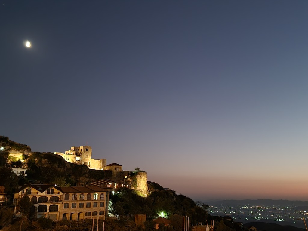 Comme notre vol partait vers 20h, nous n’avons pas eu beaucoup de temps pour explorer le village. Après le bazar, nous nous sommes promenés vite fait sur les rues, d’où nous avons pu apercevoir le château. J’aurais vraiment aimé pouvoir le visiter car il abrite 2 musées qui ont l’air vraiment bien. Ce sont le musée national de Skanderbeg et le musée ethnographique. Bon, ça sera pour une prochaine fois!