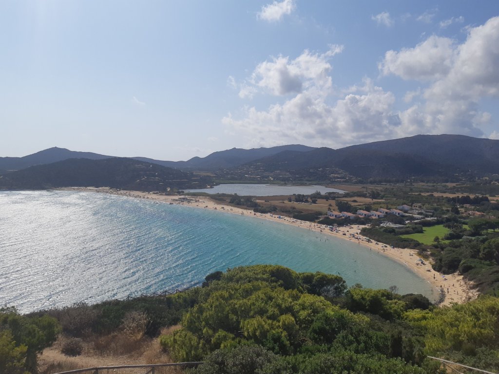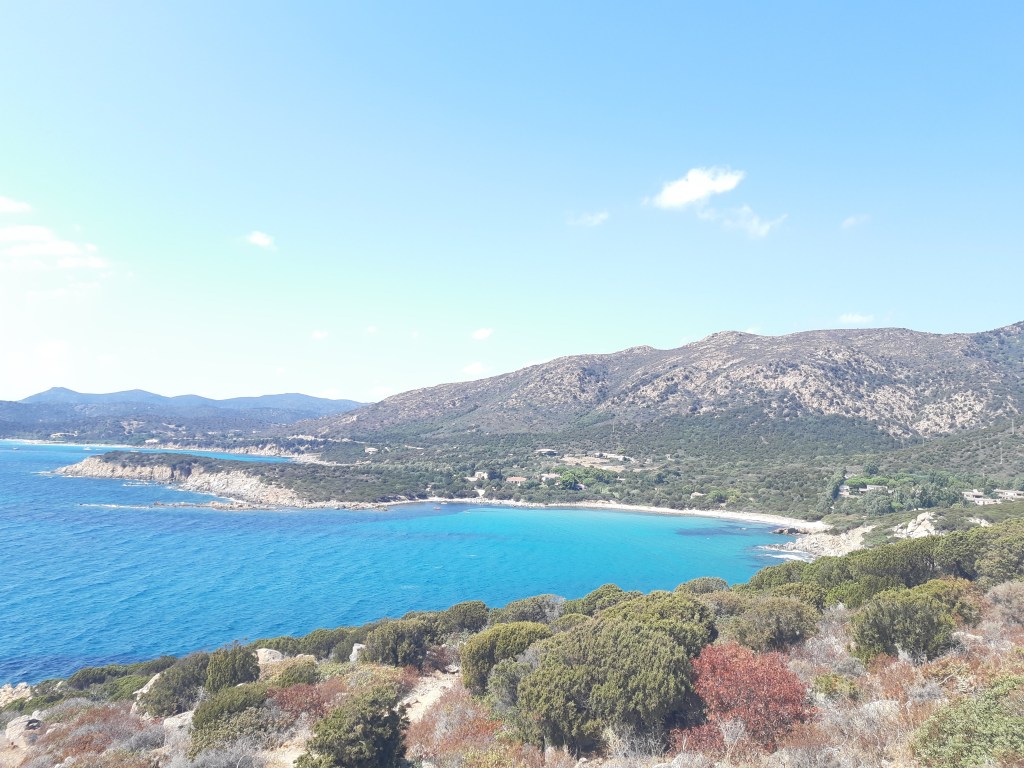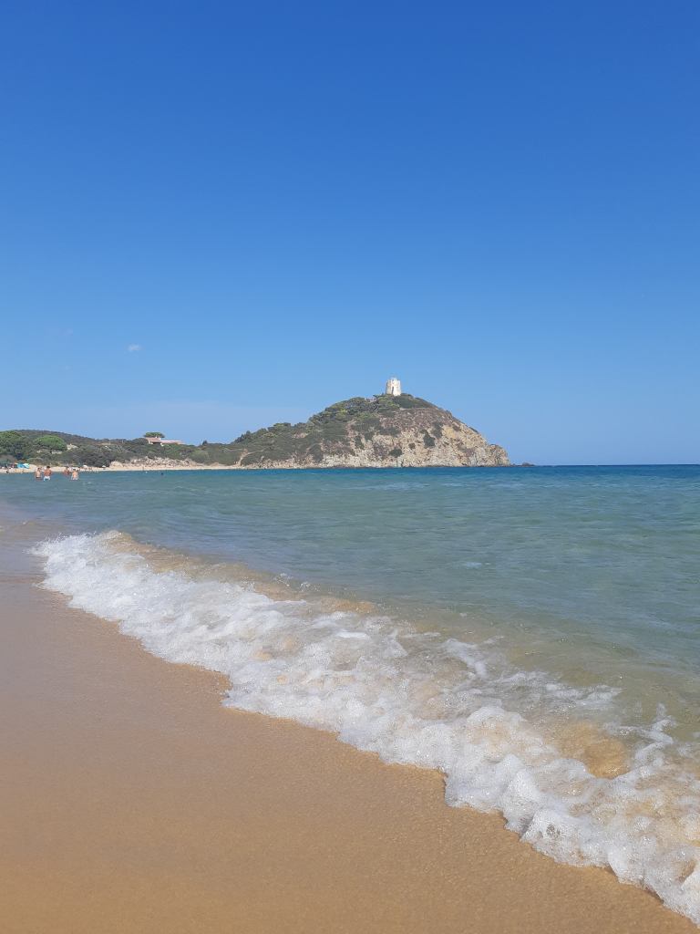 Comme nous n’aimons pas vraiment lézarder au soleil toute la journée, nous sommes partis nous promener en direction d’une tour qui se trouvait à droite de la plage. Il s’agissait de la tour de Chia, mais elle était en travaux à cette période la. Elle se trouvait en haut d’un promontoire qui nous donnait une vue panoramique de la Spiaggia di Su Portu ainsi que sa voisine, Spiaggia di Sa Colonia.