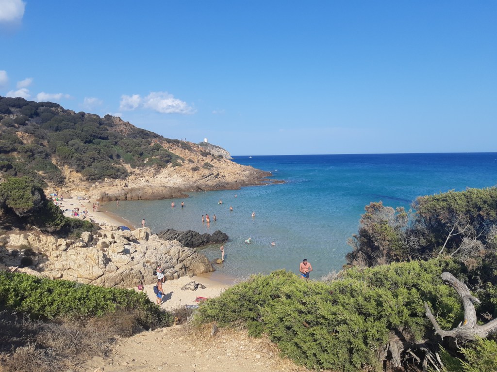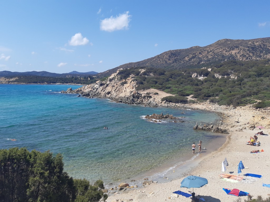 De retour à notre AirBnb, nous avons fait le check-in puis sommes encore repartis, cette fois-ci pour explorer les plages de la région de Chia. Pour faire cela, nous avons marché jusqu’à l’arrêt bus ou nous pouvions emprunter un bus qui longeait la côte. Ce bus était top car il s’arrêtait à quasiment toutes les plages sympas de la région.