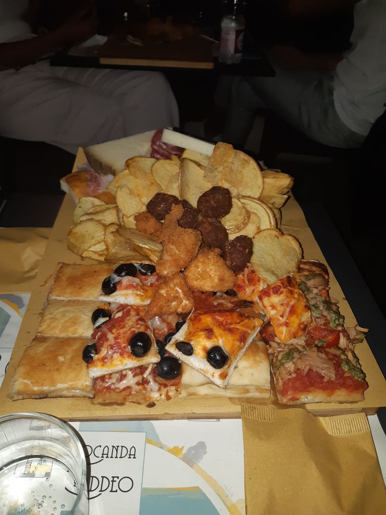 De retour à Pula, nous nous sommes douchés et préparés pour sortir à la recherche d’un restaurant. On n’imaginait pas comment cela serait difficile… Il était vendredi soir et le centre ville débordait de monde. Nous sommes allés vers un restaurant bien noté et ils ont demandé si nous avions une réservation. Quand nous avons dit non, ils nous ont dit que ce n’était pas possible de nous recevoir. Et cela s’est répété au moins 5 fois dans d’autres restaurants. C’était tout simplement incroyable, tous les restaurants étaient complets. Au bout de 1h nous avons enfin trouvé de la place dans un bar qui servait des planches, appelé Locanda Caddeo. Ce n’était pas ce que nous avions prévu, mais nous n’avions pas vraiment le choix. Nous avons quand même eu de la chance car la planche que nous avons commandé était tout simplement immense et très bonne! Si je ne me trompe pas, la planche nous a coûté 20€ et était largement suffisante pour nous 2.