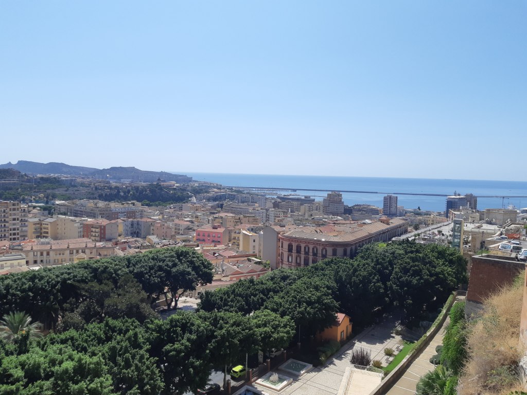Notre dernier jour en Sardaigne a commencé avec le trajet de bus en direction de Cagliari. Arrivés à la gare centrale, nous sommes partis en direction de la vieille ville. Nous avons visité le Bastion Saint Remy, une grande place perchée en hauteur d’où nous avions une superbe vue sur la ville et la mer.