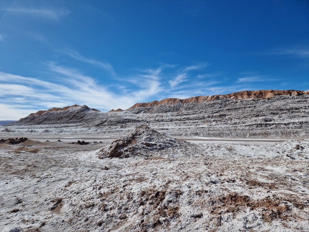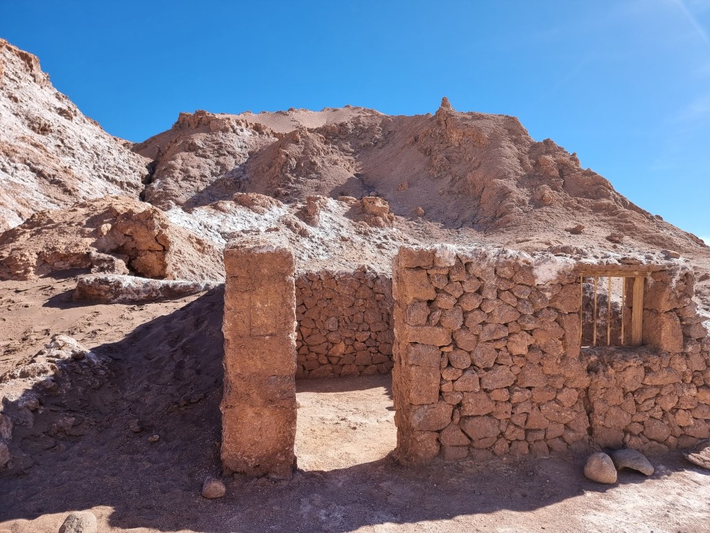 La deuxième partie du parcours était assez différente: la couleur ocre du sable et des roches côtoyait des tâches blanches qui s’étendaient au loin. De la neige? Non, ces points blanchâtres étaient du sel, une ressource dont le désert de l’Atacama regorge. Nous nous sommes arrêtés pour emprunter un tout petit sentier qui nous a amène à l’intérieur des montagnes blanchis pour découvrir une ancienne mine de sel. La différence entre les deux portions du parc est vraiment marquante et elle était le premier aperçu que j’ai eu de la diversité des paysages de ce désert.