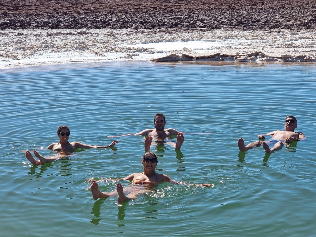 Après notre petite balade, nous nous sommes mis en maillot de bain pour tester l’eau de la première lagune. Il faisait assez bon, environ 26°C mais la température de l’eau n’était pas du tout la même! Elle était gelée, facilement à moins de 10°C. Quand je suis rentrée j’ai instantanément regretté mon choix suite au choc thermique. Cependant, après quelques minutes la température est devenue plus supportable, mais pas encore agréable. La sensation de se baigner dans cette lagune est assez spéciale, car la concentration de sel ici est encore plus élevé qu’à la Mer Morte. Vous flottez sans aucun effort et c’est quand même assez marrant.