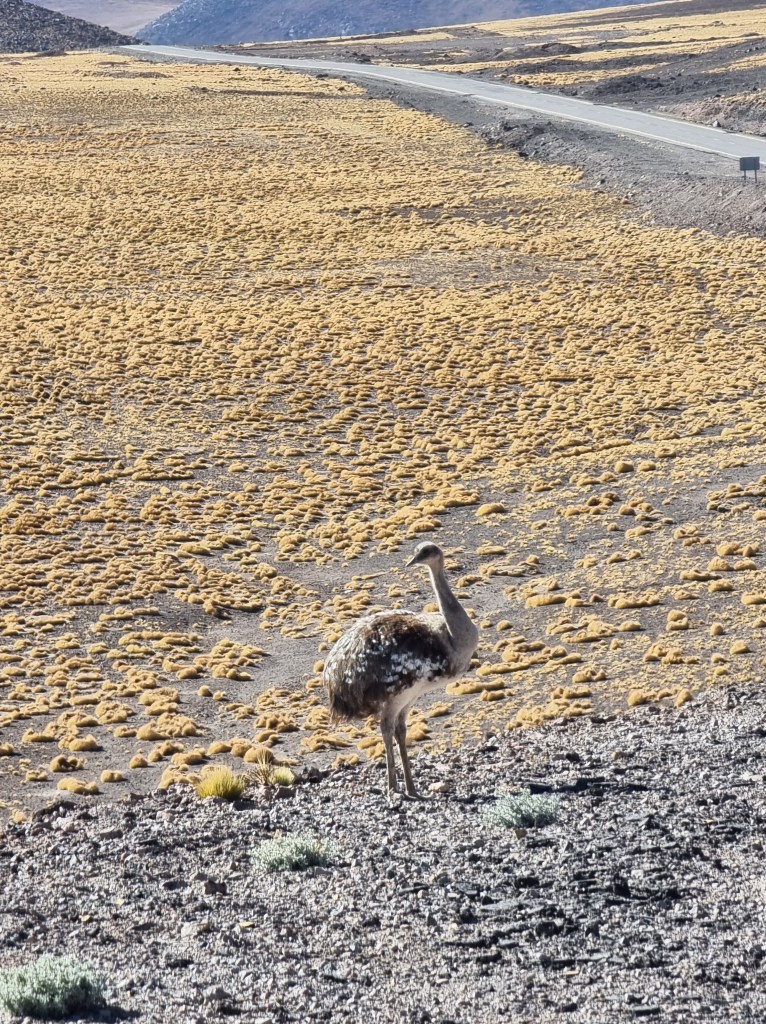 Il faut savoir qu’il y a une augmentation considérable d’altitude dans cette région: jusqu’à 1700 mètres de plus en comparaison à San Pedro de Atacama. De ce fait, il faut éviter de courir et marcher doucement car les effets de l’altitude se ressentent encore plus. J’ai couru 2 minutes pour voir un émeu qui traversait la route et j’étais tout suite à bout de souffle.