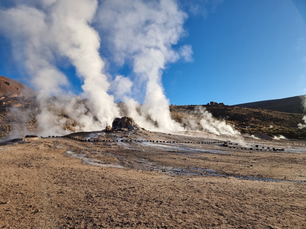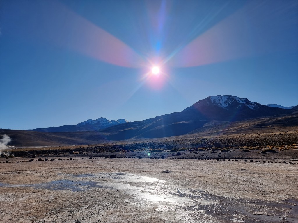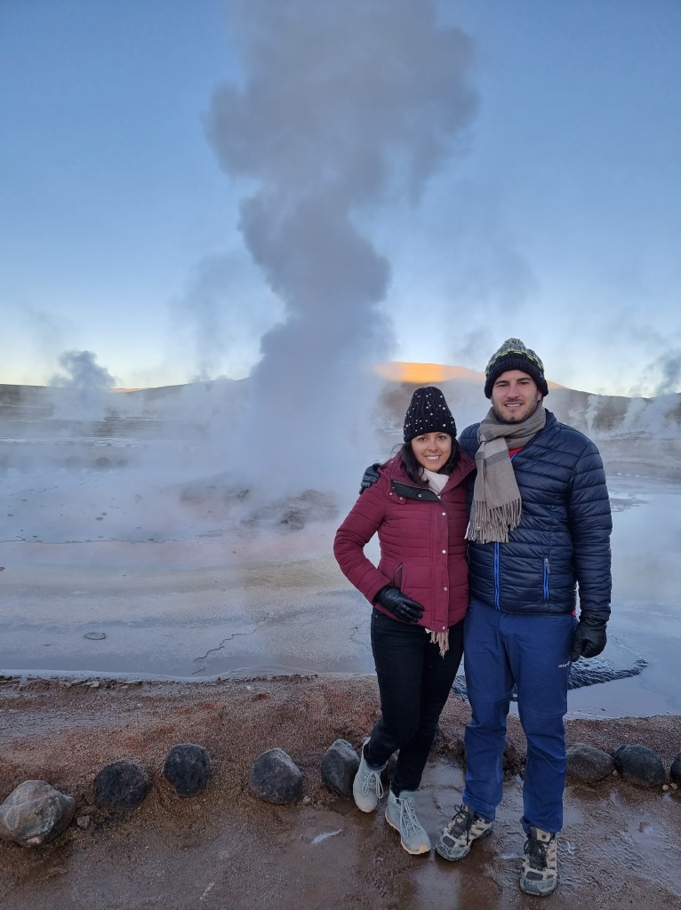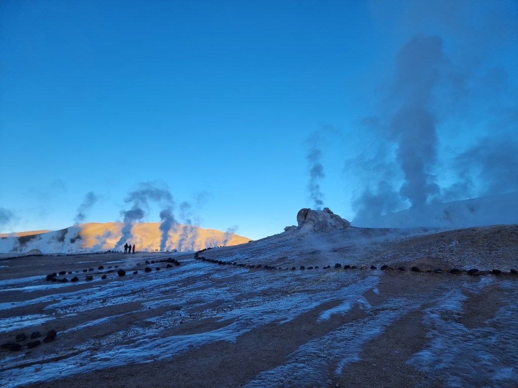Après environ 2h de route, nous sommes enfin arrivés à El Tatio et le soleil commençait a se lever. Il faisait très froid, environ -10°C quand nous sommes sortis de la voiture. En arrivant nous avons acheté nos billets, qui ont coûté 15.000 pesos par personne. A l’intérieur du parc, il y a 2 zones différentes à explorer. Comme d’habitude, quelqu’un nous a expliqué le parcours et nous a donné les consignes de sécurité, assez importantes dans une zone géothermale. En parlant de zone géothermale, El Tatio s’avère être la plus haute au monde!