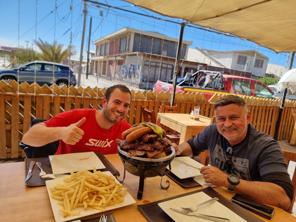 Après environ 2h30 de route, nous étions arrivés à Calama vers midi. Comme notre vol décollait seulement à 17h00, nous avons pour se poser au restaurant. Nous avons choisi le restaurant Rustico et nous avons goûté sa parrillada. Il s’agit d’un mélange de différents types de viande cuites au barbecue. La portion était simplement énorme et nous n’avons pas tout mangé même si nous étions 4.