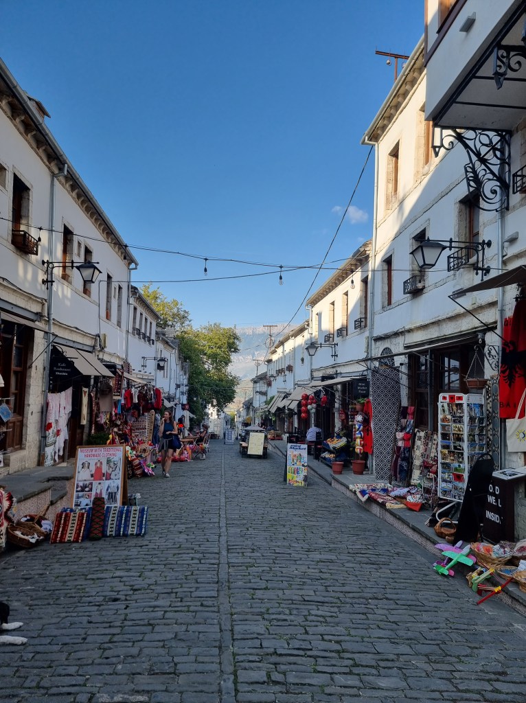 Nous avons repris la route pendant quelques minutes pour atteindre le centre ville de Vlora. La vieille ville a été clairement réhabilité de façon à plaire aux touristes, surtout les créateurs de contenu. C’est très mignon mais il a l’air un peu artificiel, surtout en comparaison au reste de la ville qui a un caractère plus ‘brut’.